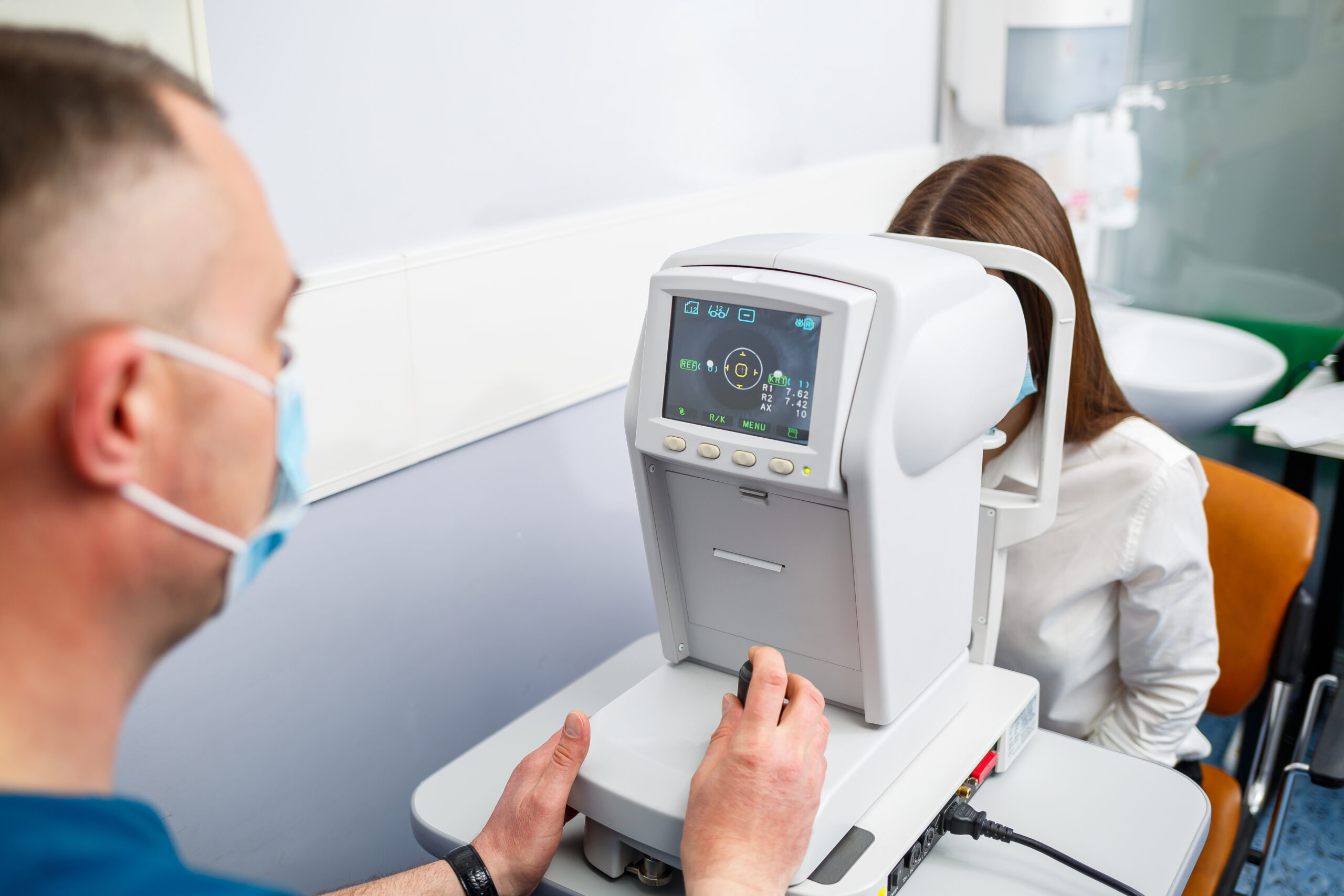 Keratometer measures corneal curvature for astigmatism detection and contact lens fitting.