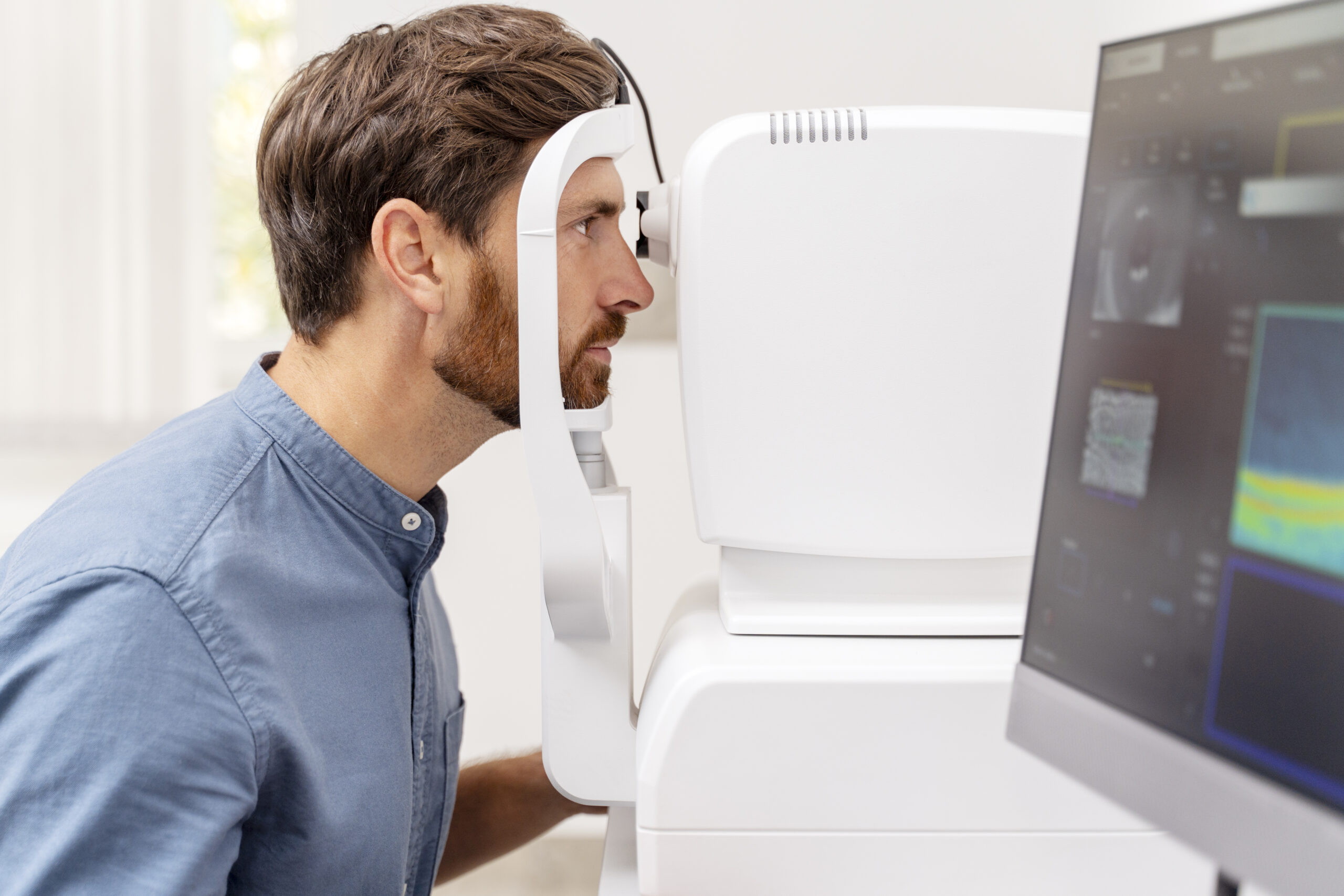 The IOL Master measures eye dimensions for precise lens selection in cataract surgery.
